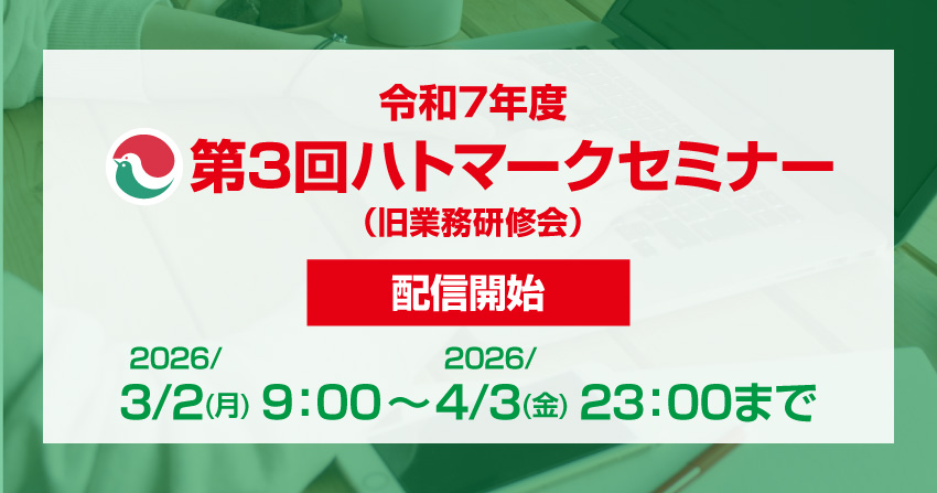3月2日午前9時より「第3回ハトマークセミナーオンライン研修(録画配信)」を公開いたします。(視聴はハトサポへのログインが必要です)公開期間は2026年4月3日まで 詳しくはこちら